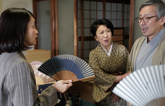 SHIBUSAWA Madoka (FUKAGAWA Mai), a Tokyo-based manga writer is on a trip to Kyoto after recently marrying the 14th-generation heir to a traditional folding-fan shop in the city. Determined to understand the exquisite essence of Kyoto, she sets out to write a comic essay about life in the city’s historic businesses and the centuries of tradition they embody. Along the way, she interviews her husband’s family and various local okami — female business proprietors — across town, accompanied by her loyal manga artist friend, ANZAI Riko (ONODERA Zuru).